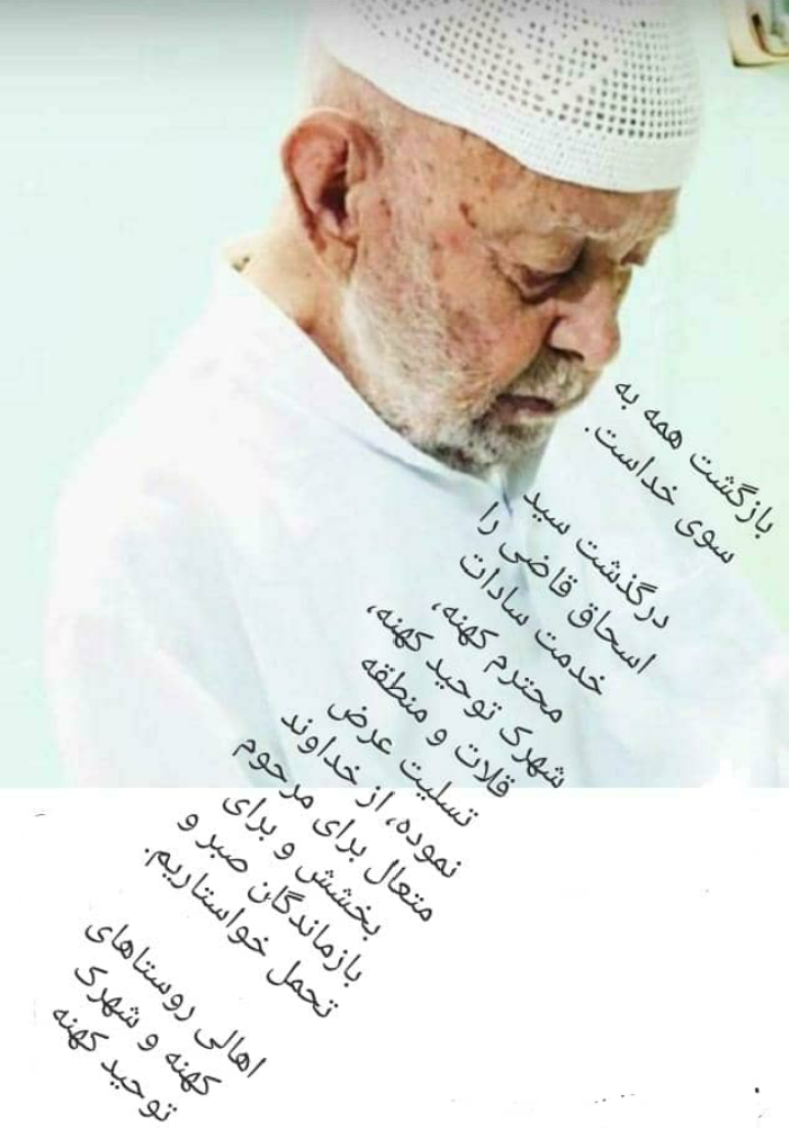 بازگشت همه به سوی خداست سادات محترم روستاهای کهنه، شهرک توحید کهنه، قلات و منطقه بدینوسیله درگذشت سید اسحاق قاضی (حسینی) را خدمت شما، سایر اقوام و جماعت تسلیت عرض نموده، از بارگاه خداوند متعال برای مرحوم طلب بخشش و عفو و برای بازماندگان صبر و شکیبایی خواستاریم. روح شان شاد. مرحوم حاج سید اسحاق حسینی معروف به سید اسحاق قاضی فرزند مرحوم سید محمد، از مدرسین قرآن کریم در مکتب خانه ها در روستای کهنه به دلیل کهولت سن صبح یکشنبه ششم تیرماه چشم از جهان فرو بست. |