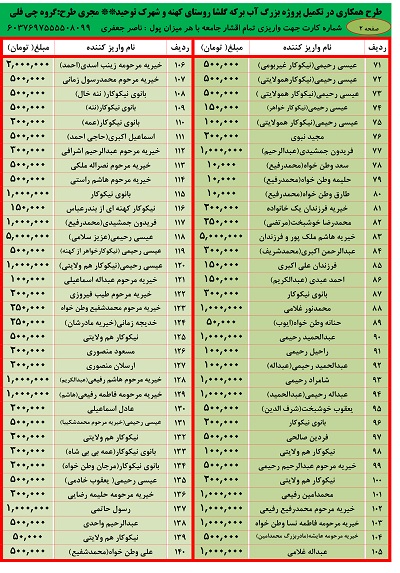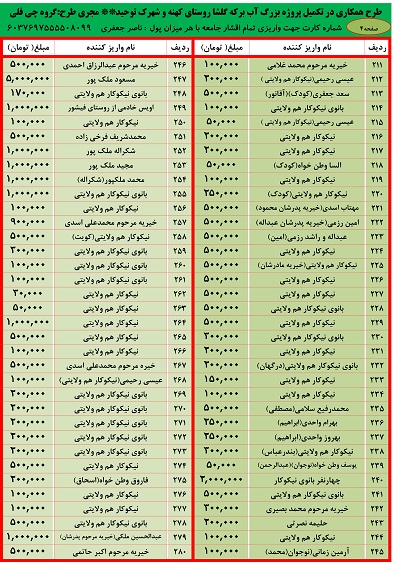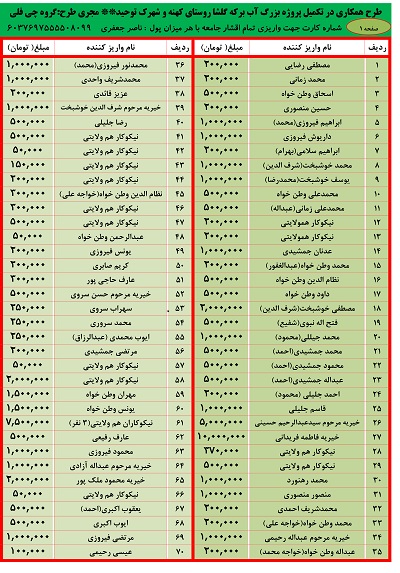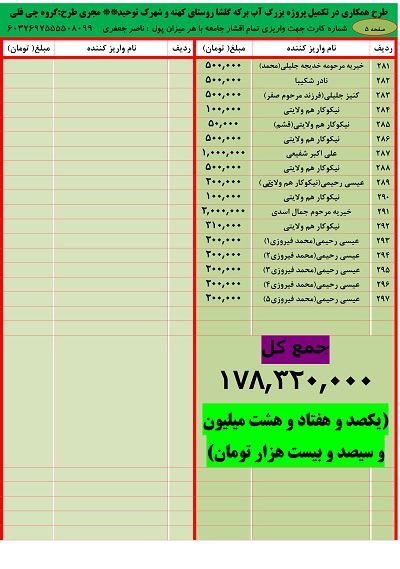 همه آمدند تا "آب" _این میراث گرانبها در منطقه ای با اقلیم گرم و کم آب_ را به عنوان امانتی گرانبها برای نسل های بعدی به یادگار بگذارند. اکنون که در آستانه بهبود کیفی و کمّی آب و آبرسانی دو روستا از طریق آب برکه گلشا هستیم جا دارد از همه ی بزرگان، نیکوکاران و مسئولینی که از ابتدا تا اکنون در روند آبرسانی زحمت کشیده اند، یاد و قدردانی کنیم و همواره به یاد داشته باشیم که آب برکه گلشا میراث گرانبهای بزرگان و امانتی برای آیندگان، ضرورت امروز و ضمانت فرداهای ما می باشد. دویست و نود و هفت نفر در مشارکت مردمی در گروه واتساپی چَی فَلی، مبلغ صد و هفتاد و هشت میلیون و سیصد و بیست هزار تومان برای تکمیل پروژه آب برکه گلشا به هیئت آب روستاهای کهنه و شهرک اهدا نمودند. می توان گفت این مشارکت، بزرگترین مشارکت مردمی از لحاظ تعداد افراد شرکت کننده در طول تاریخ دو روستا می باشد. ثبت و مدیریت اسامی خیرین: اسحاق وطن خواه و محمد زمانی برای دانلود فایلpdf اسامی همه خیرین با مبلغ اهدایی(297 نفر) بر روی لینک زیر کلیک نمایید.