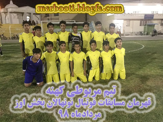 مسابقات فوتبال نونهالان بخش اوز در مردادماه 98 با شرکت 9 تیم زیر نظر هیئت فوتبال بخش اوز استارت خورد و با قهرمانی تیم مربوطی کهنه خاتمه پذیرفت و شاهین فیشور مقام دوم و شهیدجعفریان کهنه مقام سوم کسب کردند. پس از اتمام مرحله گروهی تیم های مربوطی کهنه و شاهین فیشور با غلبه بر نفت اوز و شهیدجعفریان کهنه به فینال این مسابقات راه یافتند. قبل از آغاز دیدار نهایی ، تیم های شهیدجعفریان کهنه و نفت اوز در بازی رده بندی به مصاف هم رفتند که با بیرون کشیدن تیم نفت اوز ، بنا به تصمیم کمیته اجرایی و انضباطی نتیجه این دیدار 3 بر 0 به سود شهیدجعفریان کهنه اعلام شد. مسابقه فینال در حضور رئیس هیئت فوتبال اوز مهرداد پیشداد و جمعی از پیشکسوتان ورزش روستای کهنه و اوز و همچنین والدین برخی بازیکنان در زمین شهدای اوز با قضاوت یونس پرمون و محمد فرجی آغاز شد. هر دو نیمه وقت های قانونی و اضافه مسابقه با برتری توپ و میدان توسط تیم مربوطی کهنه همراه بود ولی نتوانستند از این برتری استفاده نمایند تا درنهایت هر دو تیم مربوطی کهنه و شاهین فیشور با نتیجه تساوی صفر بر صفر به استقبال ضربات پنالتی بروند. حامد صابری دروازه بان تیم مربوطی کهنه با درخشش خود و مهار 2 ضربه پنالتی راه قهرمانی تیم مربوطی را هموار کرد و ضربات عرفان اکبری و آرش زمانی نیز وارد درواره شد تا تیم مربوطی کهنه با نتیجه 2 بر 1 فاتح ضربات پنالتی و جام قهرمانی شود. اهدای کاپ تیم ها و بازیکنان برتر به صورت همزمان با برترین های مسابقات نوجوانان و بزرگسالان در مراسمی ویژه صورت می گیرد.