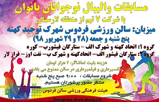 با برنامه ریزی و تلاش هیئت فرهنگی ورزشی سالن فردوس با همکاری هیئت والیبال بخش اوز و خانم مرادی مربی شناخته شده والیبال منطقه، یک دوره مسابقات والیبال نوجوانان بانوان زیر 17 سال با شرکت هفت تیم از منطقه لارستان در سالن فردوس در روزهای پنج شنبه و جمعه 28 و 29 شهریورماه 98 برگزار خواهد شد.