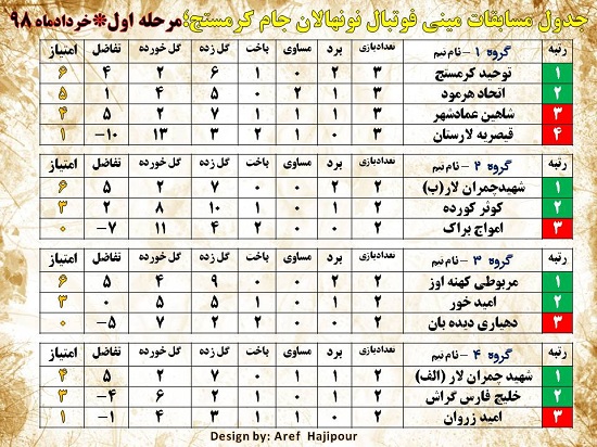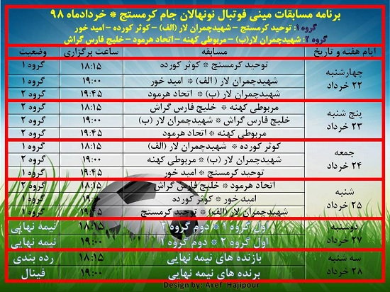 گروه بندی مرحله دوم بدین شکل می باشد: گروه 1: توحید کرمسج ، شهیدچمران لارستان (الف) ، کوثر کورده ، امید خور گروه 2: شهیدچمران لارستان(ب) ، مربوطی کهنه ، اتحاد هرمود ، خلیج فارس گراش برنامه بازی های آتی پنج شنبه 23 خردادماه مربوطی کهنه – خلیج فارس گراش (18:15) خلیج فارس گراش – شهیدچمران لارستان(ب) (19:00) مربوطی کهنه – اتحاد هرمود (19:45) جمعه 24 خردادماه کوثر کورده – شهیدچمران لارستان(الف) شهیدچمران لارستان(ب) – مربوطی کهنه (19:00) توحید کرمستج – امید خور(19:45) |