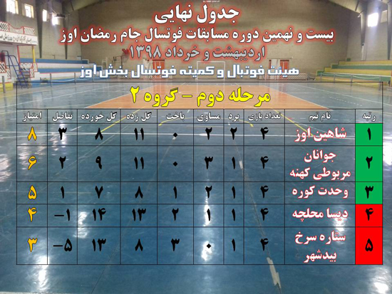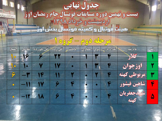 مرحله مقدماتی مسابقات فوتسال آزاد اوز در قالب 3 گروه و مجموع 22 بازی برگزار شده ، به اتمام رسید و 6 تیم صعودکننده به مرحله دوم مشخص شدند. تیم کهنه الف با کسب 7 امتیاز به عنان تیم اول گروه خود به مرحله دوم راه پیدا کرد و تیم کهنه ب با بازیکنان آینده دار و نوجوان خود با کسب 3 امتیاز از صعود به مرحله دوم باز ماند. مرحله دوم این رقابت ها در قالب 2 گروه 3 تیمی برگزار خواهد شد که ز هر گروه 2 تیم به مرحله نیمه نهایی صعود می کنند. گروه اول: شاهین اوز – شهیدجعفریان کهنه الف – امید اوز گروه دوم : محلچه – تنگ خور – وحدت کوره طبق برنامه ریزی هیئت فوتبال اوز مسابقات مرحله دوم درشب های شنبه ، یکشنبه و دوشبه برگزار خواهد شد.