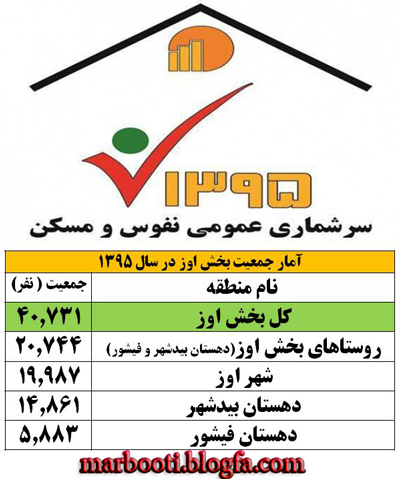 پس از اتمام سرشماری نفوس و مسکن سال 95 و اعلام آمار جمعیت از بخشداری ها و فرمانداری ها ، هر شهر و روستا از جمعیت دقیق خود مطلع شدند. بخش کهن اوز ، دارای یک شهر اوز و 2 دهستان بیدشهر و فیشور می باشد که در آمار اعلام شده از بخشداری اوز ، جمعیت روستاهای بخش اوز با کاهش جمعیت 2 هزار و 601 نفری به نسبت سال 1390 به 20 هزار 744 نفر رسید. شهر اوز نیز با کاهش جمعیت 2 هزار و 414 نفری به 19 هزار و 987 نفر رسید. در آمار اعلام شده دهستان بیدشهر با زیرنظر داشتن 9 روستا به جمعیت 14 هزار و 861 نفر رسیده است. دهستان فیشور هم جمعیت 5 هزار و 883 نفر اعلام شد.