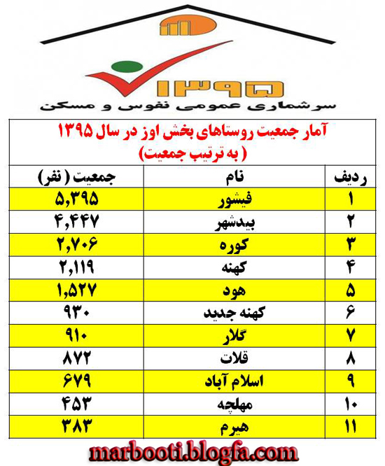 از میان روستاهای بخش اوز، روستای فیشور با افزایش جمعیت با 5 هزار و 395 نفر دارای بیشترین جمعیت بوده است. بیدشهر هم با افزایش جمعیت با 4 هزار و 447 نفر در رتبه دوم قرار گرفته است. روستای کهنه با کاهش 562 نفری نسبت به سال 1390( 2هزار و 681 نفر) به جمعیت 2 هزار و 119 نفر در سال 1395 رسیده است. کهنه جدید(شهرک توحید کهنه) با افزایش جمعیت به تعداد 930 نفر رسیده است. آمار جمعیت دقیق روستاهای بخش اوز به صورت زیر می باشد: