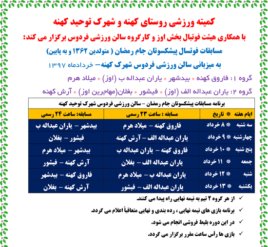 مسابقات فوتسال پیشکسوتان جام رمضان ویژه بالای 35 سال توسط کمیته ورزشی روستای کهنه و شهرک توحید کهنه با همکاری اداره ورزش و جوانان اوز ، هیئت فوتبال بخش اوز و کارگروه سالن ورزشی فردوس در این سالن با شرکت 8 تیم برگزار می شود. در این دوره 8 تیم شرکت کننده در قالب 2 گروه 4 تیمی به رقابت می پردازند که در نهایت از هر گروه 2 تیم به مرحله نیمه نهایی صعود می کنند. گروه 1: فاروق کهنه – بیدشهر – یاران عبداله ب(اوز) – میلاد هرم گروه 2: یاران عبداله الف(اوز)- فیشور – بغلان (مهاجرین اوز)- آرش کهنه بازی افتتاحیه در سه شنبه شب 8 خردادماه ساعت 23 بین دو تیم فاروق کهنه و میلاد هرم در سالن ورزشی شهرک توحید کهنه برگزار می شود. برنامه بازی های مرحله گروهی به شکل زیر می باشد: