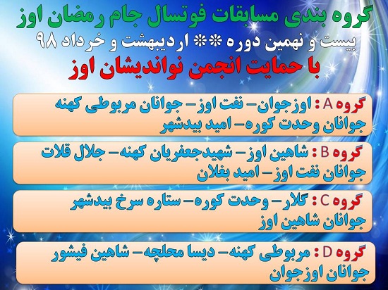 گروه 1: یاران مرشد کهنه - خرده دره - جلال قلات - امید زاهدان گروه 2 : اوزجوان - فرهنگیان کهنه - چغان - بغلان جوان گروه 3: لاغران - شاهین اوز - جوانان کهنه - بیدشهر ب گروه 4 : بیدشهر الف - دیسامحلچه - نفت اوز - آرش کهنه مراسم با پذیرایی از دوستان به اتمام رسید.