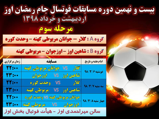 شنبه 11 دی ماه ساعت 20:30 ( شاهین اوز – شهیدجعفریان کهنه الف) ساعت 21:30 ( وحدت کوره – محلچه) یکشنبه 12 دی ماه ساعت 21:30 ( شاهین اوز – امید اوز) ساعت 22:30 (محلچه - تنگ خور) دوشنبه 13 دی ماه ساعت 20:30 ( امید اوز – شهیدجعفریان کهنه الف) ساعت 21:30 ( تنگ خور – وحدت کوره ) شرح بازی های تیم شهیدجعفریان کهنه ب : این تیم یکدست ، نوجان آینده دار روستای کهنه در اولین بازی خود با علی الرقم انجام دادن بازی خوب و تماشاگرپسند بانتیجه 3 بر 2 مغلوب تیم باتجربه وحدت کوره شد. در دومین بازی هم در مقابل یکی از مدعیان اصلی کسب عنوان قهرمانی شکست خورد. این تیم در سومین و آخرین بازی خود در مقابل نفت اوز قرار گرفت که با خودباوری و کسب تجربه از بازی های قبلی توانستند 3 بر 1 از سد تیم نفت اوز عبور کنند. در این بازی محمدعلی وطن خاه ، فؤاد رهنورد و عبدالرحمن اکبری گلزنان تیم کهنه بودند. تماشاگران غیور و پرشور روستای کهنه در هر 3 بازی این تیم حضوری چشمگیر داشتند و باعث دلگرمی این نوجوانان شدند. سعید صادق پور سرمربی این تیم و کمیته ورزشی روستای کهنه از تمام این عزیزان تقدیر و تشکر ویژه ای دارد.