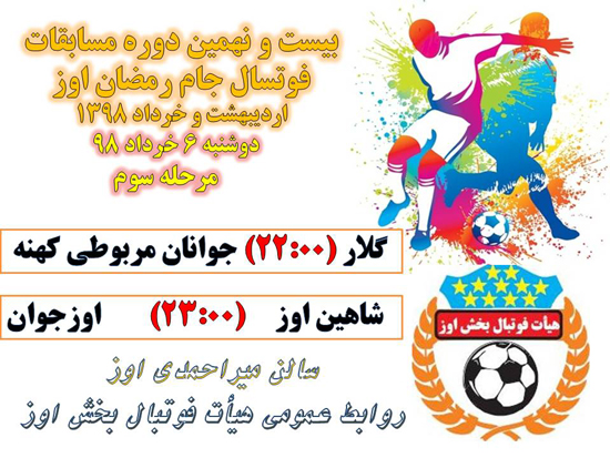 برنامه بازی های امشب دوشنبه 6 خرداد به صورت زیر می باشد: ساعت 22:00 ( گلار – جوانان مربوطی کهنه ) ساعت 23:0 ( شاهین اوز – اوزجوان )