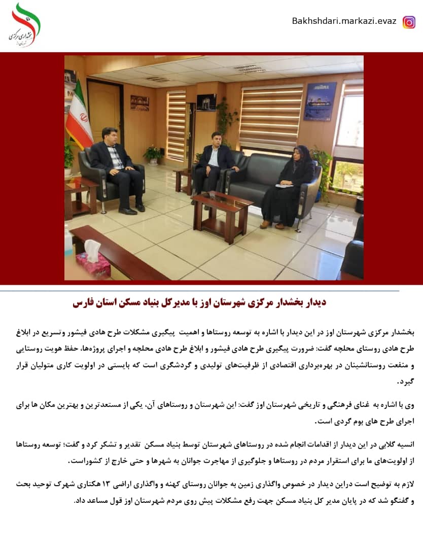 دیدار بخشدار مرکزی شهرستان اوز با مدیرکل بنیاد مسکن استان فارس بخشدار مرکزی شهرستان اوز در این دیدار با اشاره به توسعه روستاها و اهمیت پیگیری مشکلات طرح هادی روستاها گفت: ضرورت پیگیری و به نتبجه رساندن طرح هادی فیشور و ابلاغ طرح هادی محلچه واگذاری اراضی به مسکن جوانان محلچه، طرح هادی و بافت ویژه کهنه اجرای پروژهها، حفظ هویت روستایی و منفعت روستانشینان در بهرهبرداری اقتصادی از ظرفیتهای تولیدی و گردشگری است که بایستی در اولویت کاری متولیان قرار گیرد. انسیه گلابی در این دیدار از اقدامات انجام شده در روستاهای شهرستان توسط بنیاد مسکن تقدیر و تشکر کرد و گفت؛ توسعه روستاها از اولویتهای ما برای استقرار مردم در روستاها و جلوگیری از مهاجرت جوانان به شهرها و حتی خارج از کشوراست . لازم به توضیح است دراین دیدار در خصوص واگذاری زمین به جوانان روستای فیشور، کهنه، شهرک توحید و محلچه بحث و گفتگو شد که در پایان مدیر کل بنیاد مسکن جهت رفع مشکلات پیش روی مردم بخش مرکزی شهرستان اوز قول مساعد داد. |