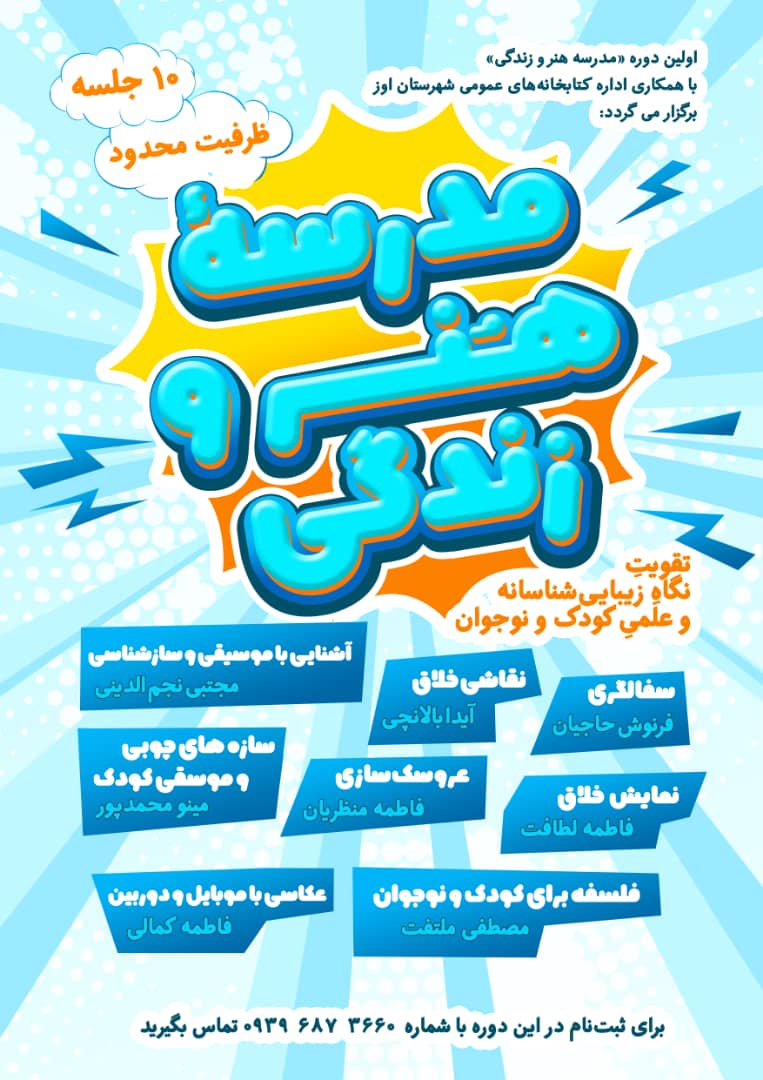 اولین دوره «مدرسه هنر و زندگی» با هدف تقویتِ نگاهِ زیبایی شناسانه و علمیِ کودک و نوجوان، با همکاری «کتابخانه اندیشه شهرستان اِوَز» برگزار می گردد: درس های ارائه شده ترم تابستانه ۱۴۰۲ عبارتند از: سازه های چوبی و موسیقی کودک / مینو محمودپور [رده سنی: ۴ سال به بالا] آشنایی با موسیقی و سازشناسی / مجتبی نجم الدینی [رده سنی: متوسطه اول و دوم] نقاشی خلاق / آیدا بالانچی (آنلاین) [رده سنی: متوسطه اول و دوم] سفالگری / فرنوش حاجیان [رده سنی: متوسطه دوم ] نمایش خلاق / فاطمه لطافت [رده سنی: چهارم تا ششم و متوسطه ] عکاسی با موبایل و دوربین / فاطمه کمالی [رده سنی: متوسطه] فلسفه برای کودک و نوجوان / مصطفی ملتفت [رده سنی: اول تا ششم ] عروسک سازی / فاطمه منظریان [رده سنی:متوسطه اول و دوم ]