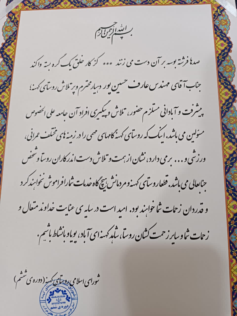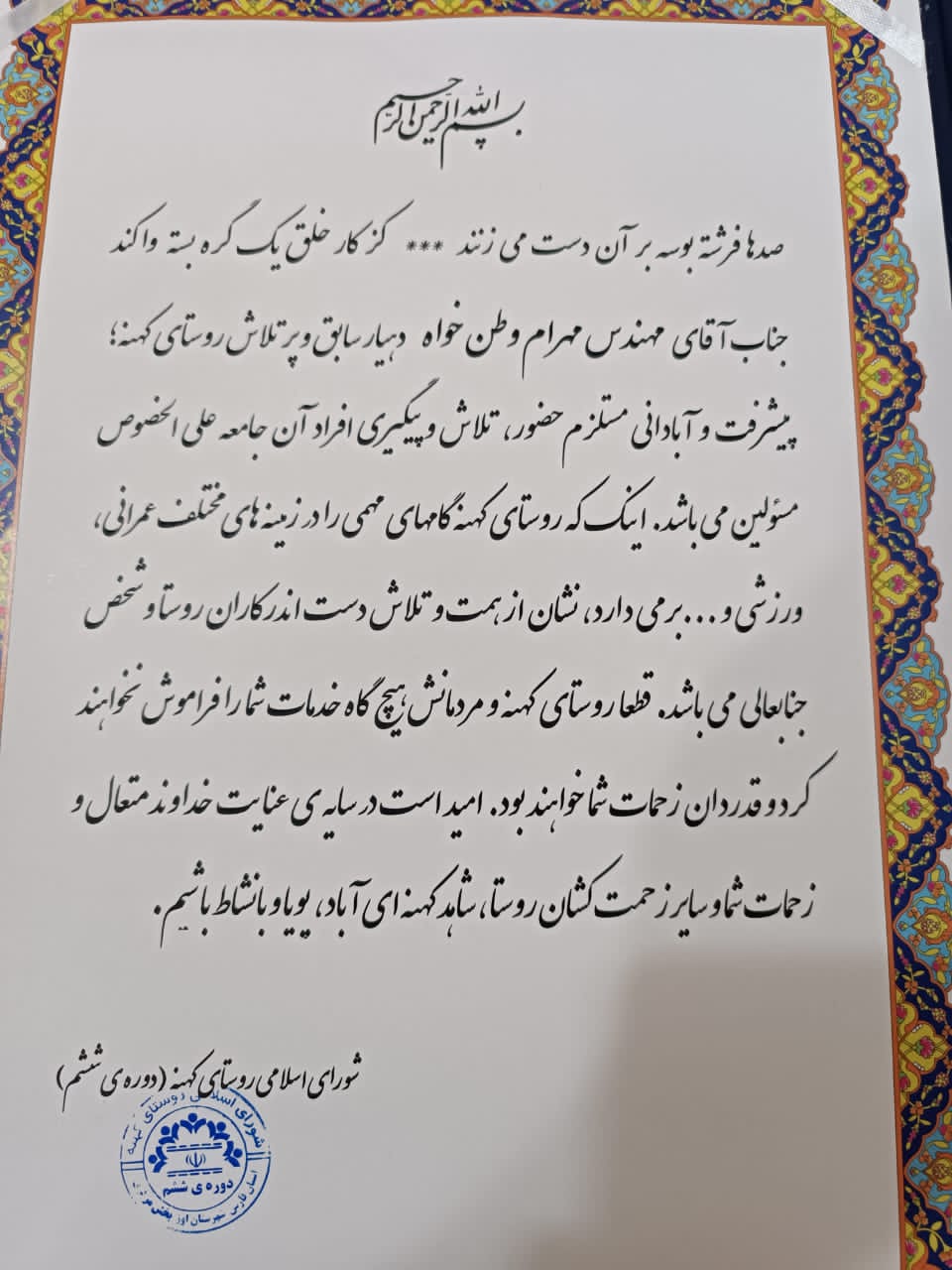 «تقدیر از دهیار فعلی و سابق روستای کهنه به مناسبت روز دهیار» جمعه ۱۶ تیر پس از نماز جمعه، به مناسبت روز دهیار و به پاس قدردانی از زحمات و تلاشهای بی وقفه ی مهندس عارف حسین پور(دهیار فعلی روستای کهنه) و مهندس مهرام وطن خواه (دهیار سابق روستای کهنه) از طرف شورای اسلامی روستا، از این دو عزیز تقدیر به عمل آمد.